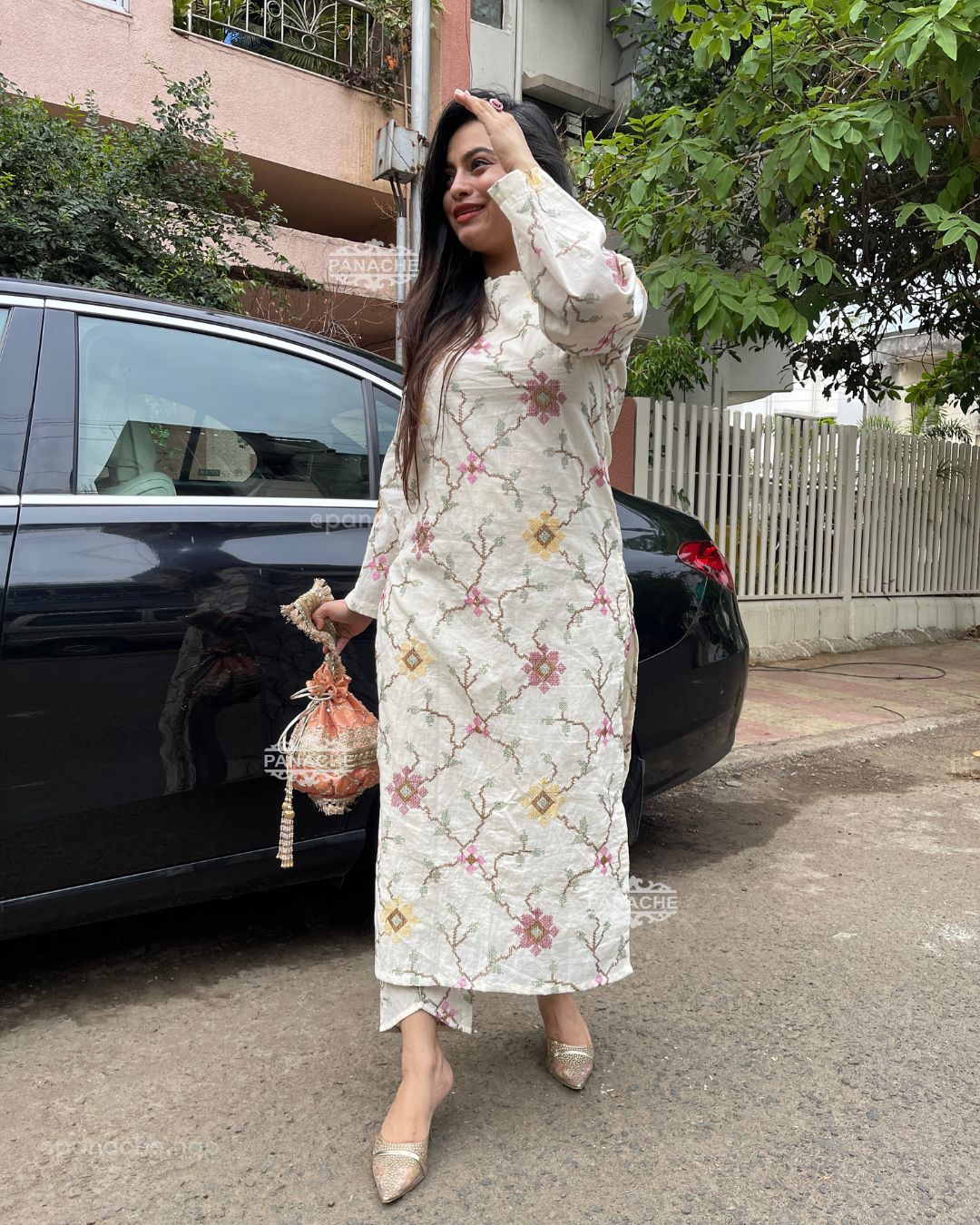 🟣 Potli on neckline of kurta front and back with embroidery all over kurta and fancy pants