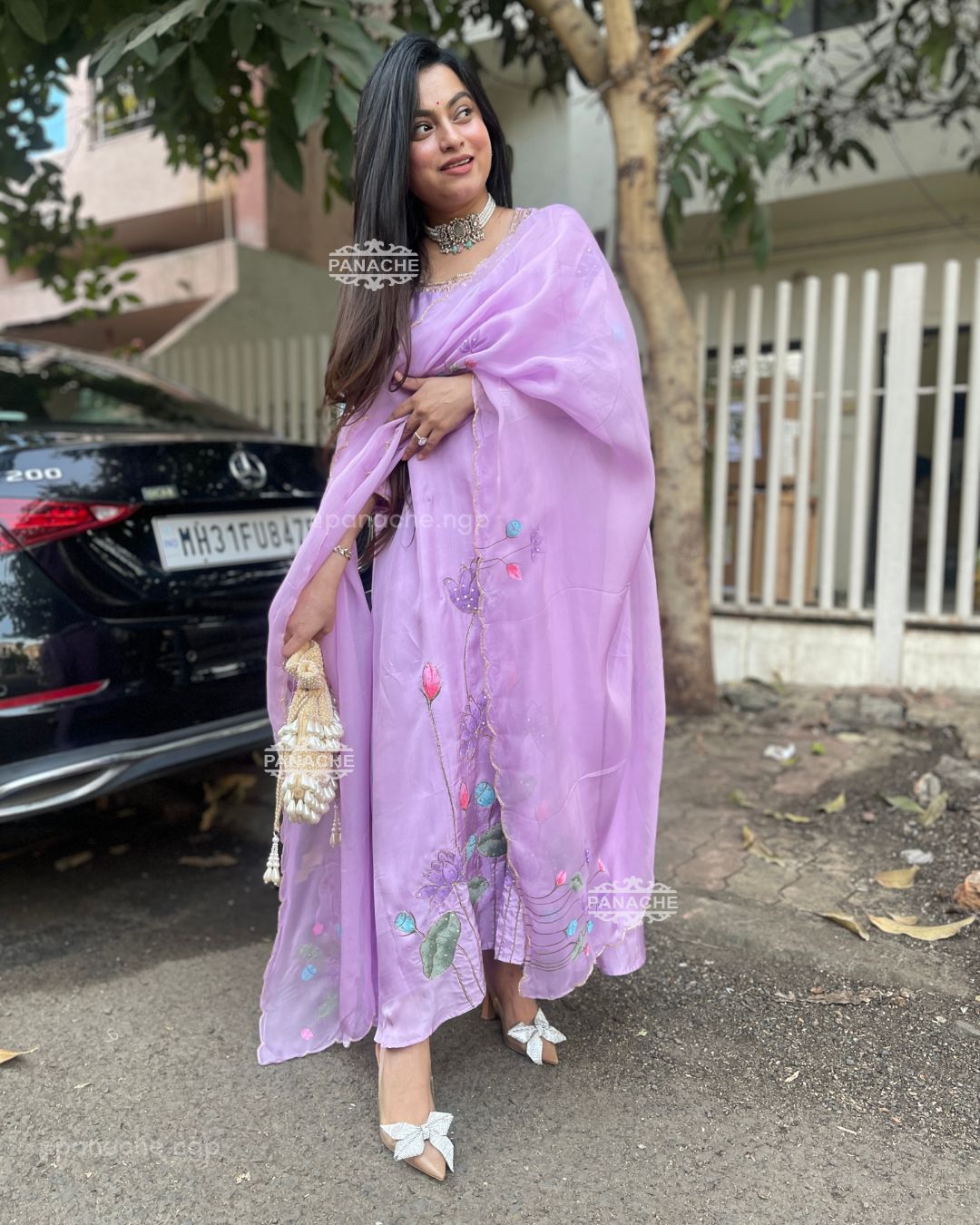🟣 Nakshi kaam detailed neckline with handpaint and highlights all over giving a serene look