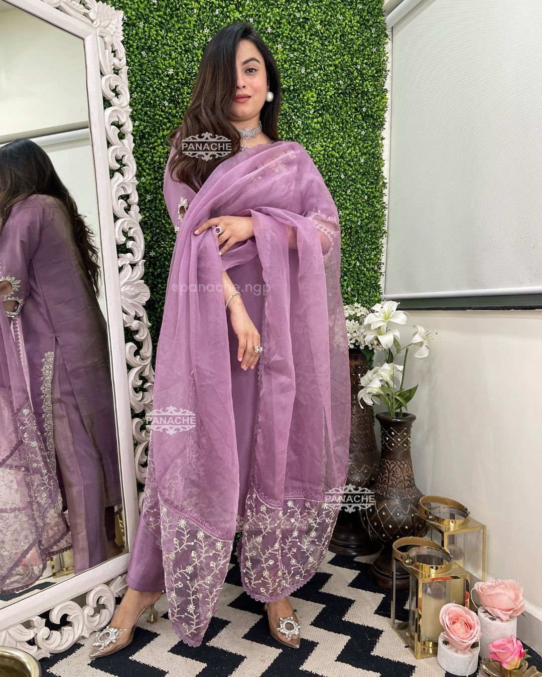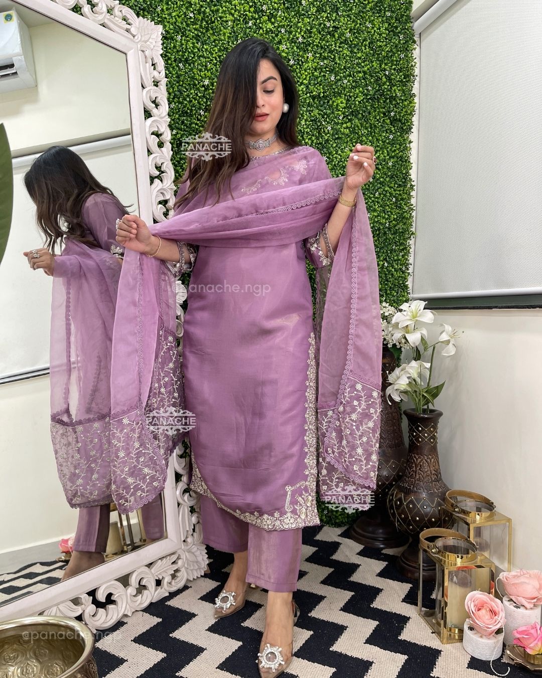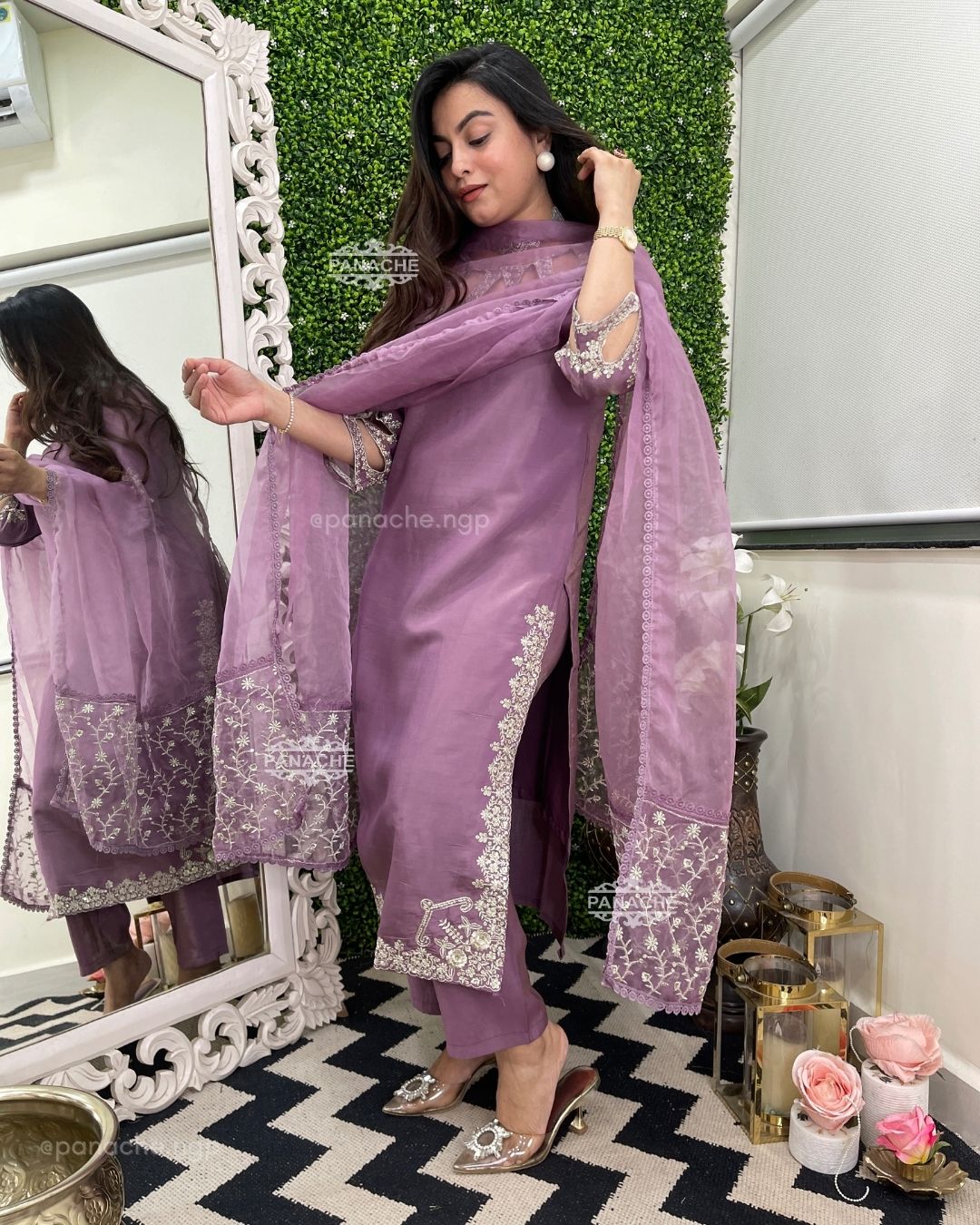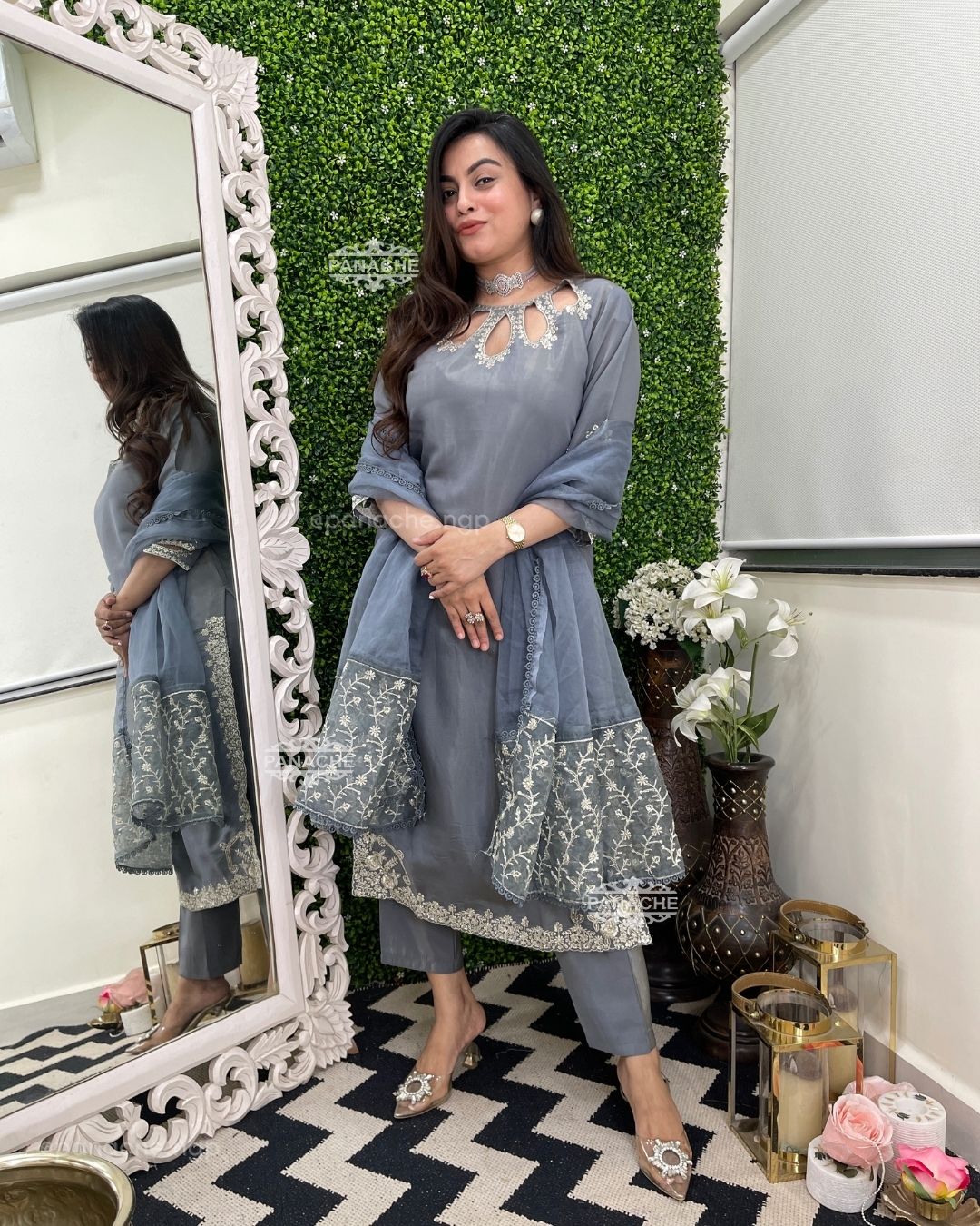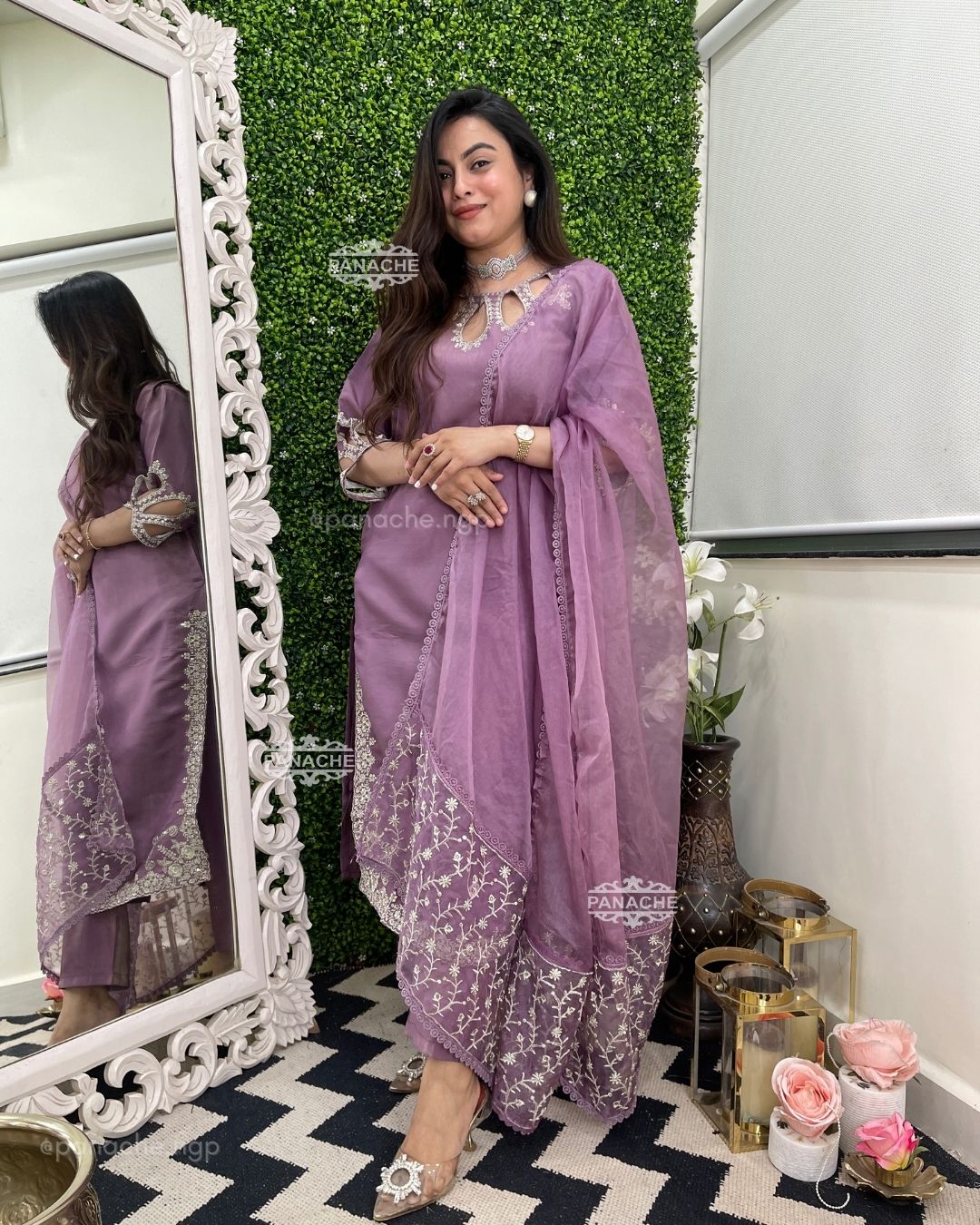 🟣 A suit a neckline the sleeves like never before ! Cutwork neckline & sleeves with heavy dupatta and heavy side slit and daman work