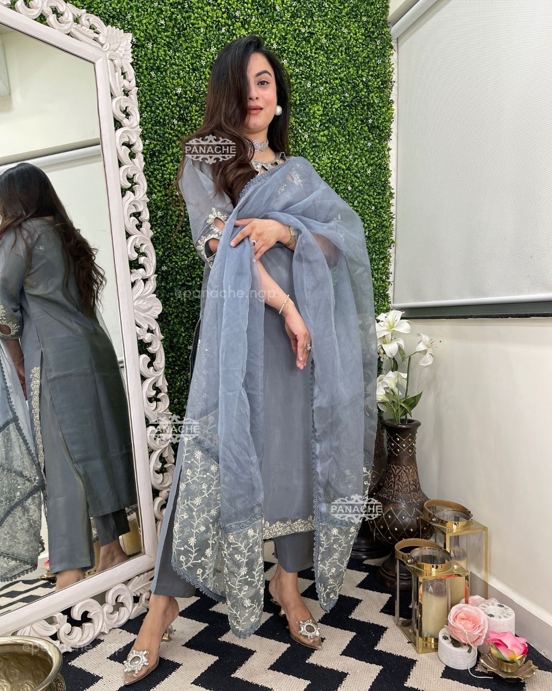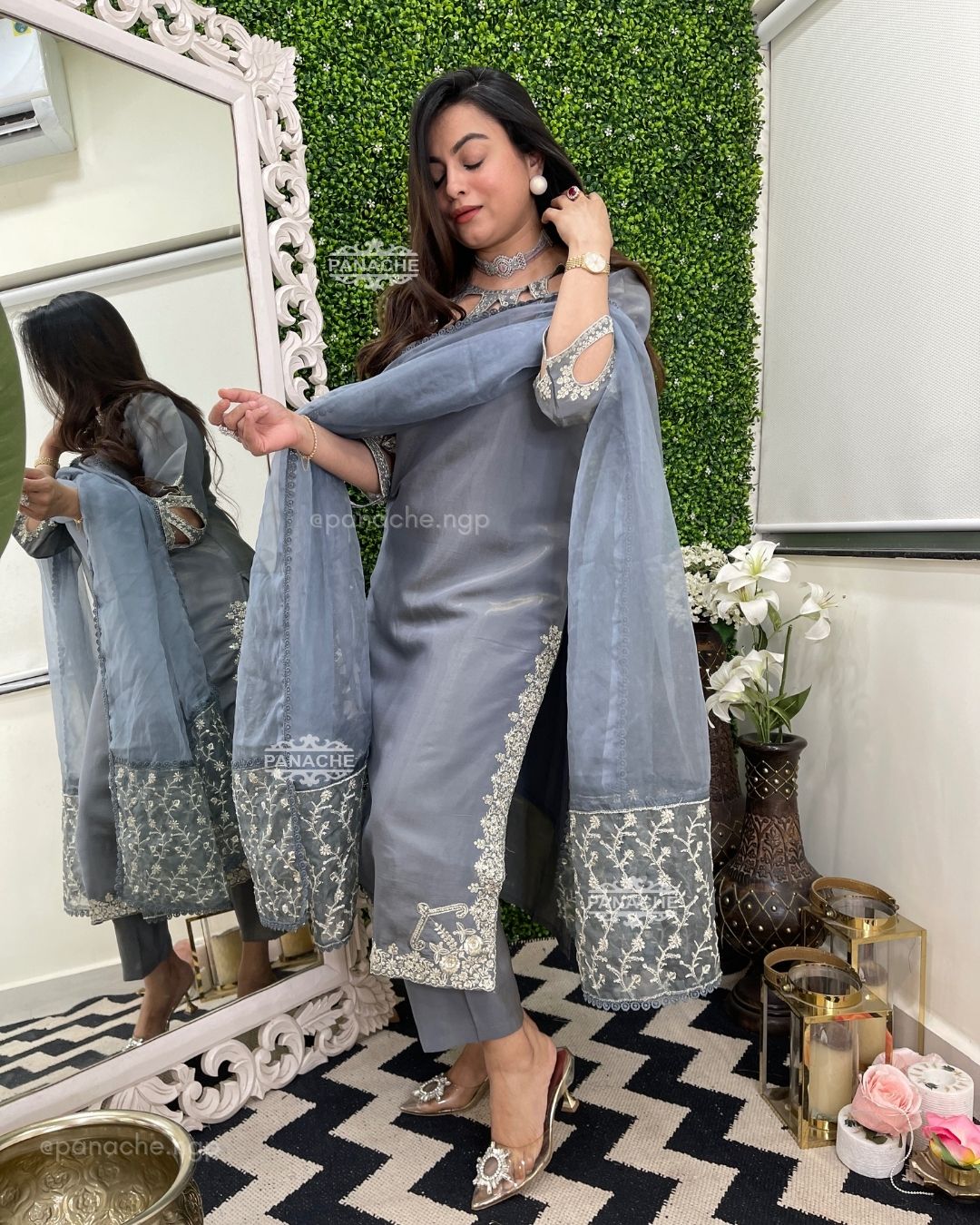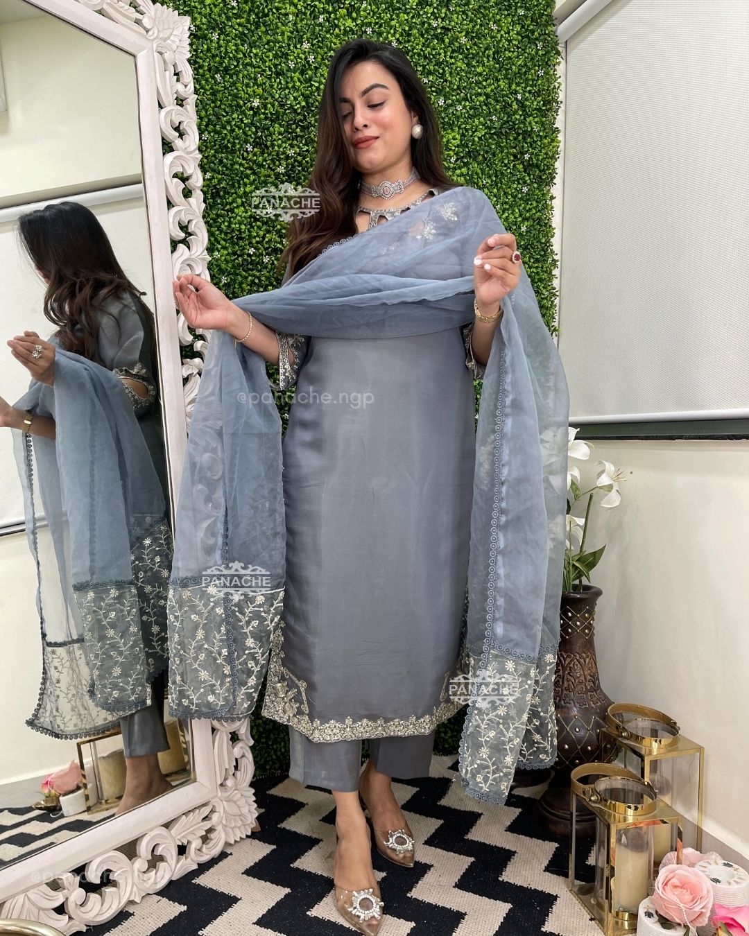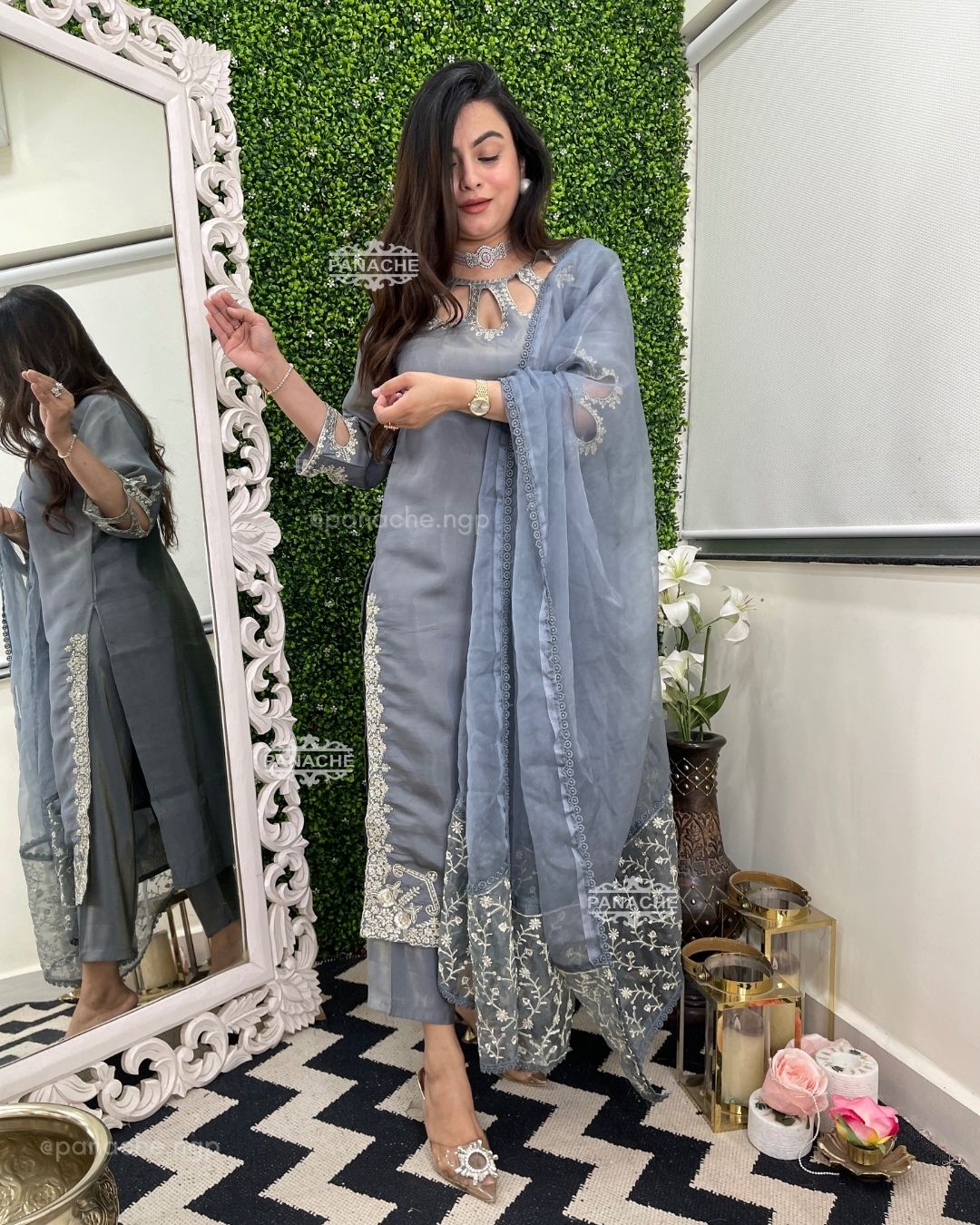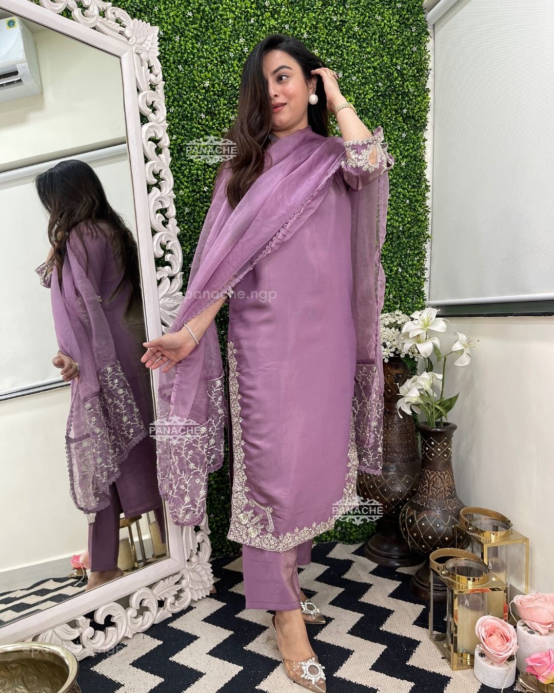 🟣 A suit a neckline the sleeves like never before ! Cutwork neckline & sleeves with heavy dupatta and heavy side slit and daman work
