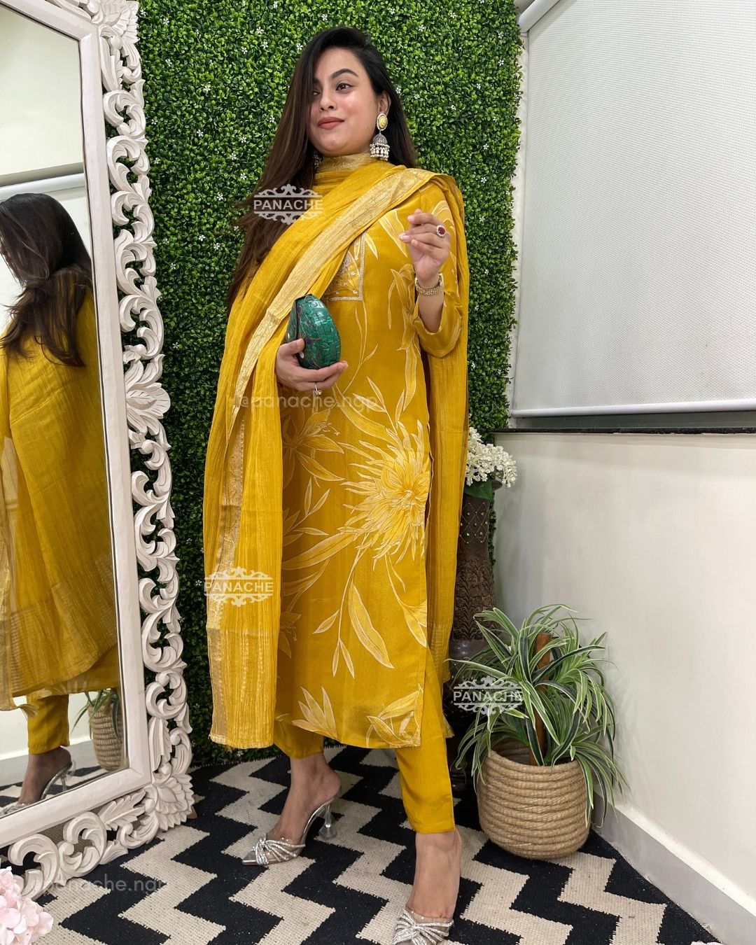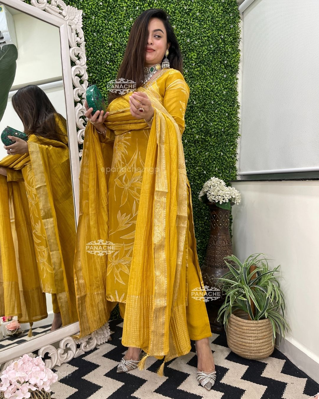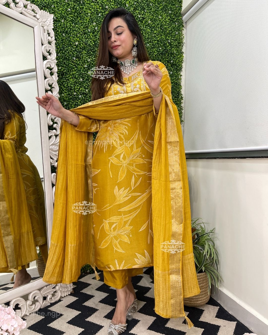 🟣 A floral kurta with pittan neckline and woven tissue dupatta with zari borders
