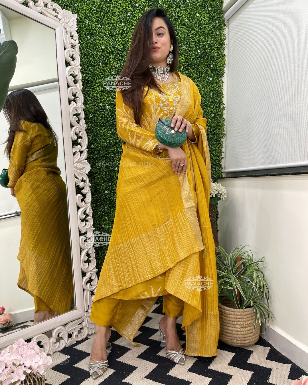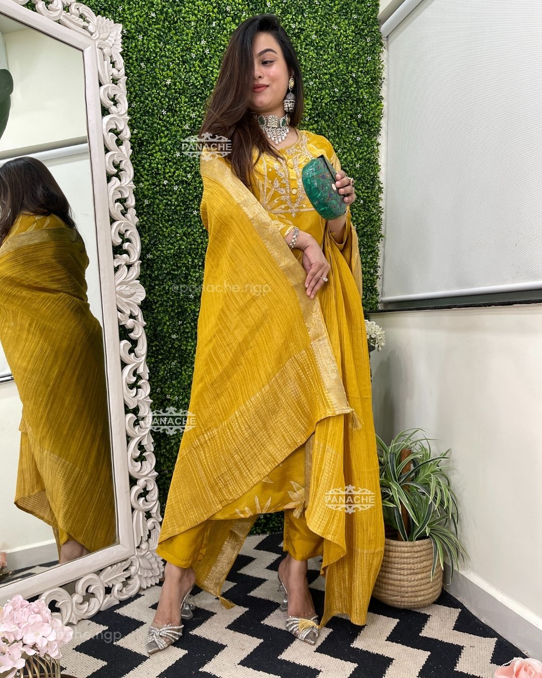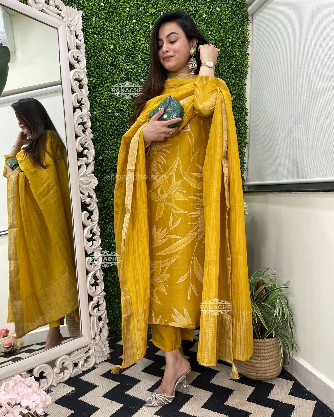 🟣 A floral kurta with pittan neckline and woven tissue dupatta with zari borders